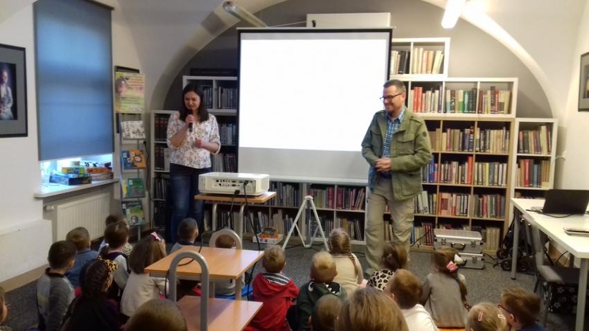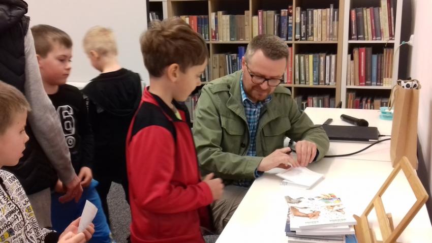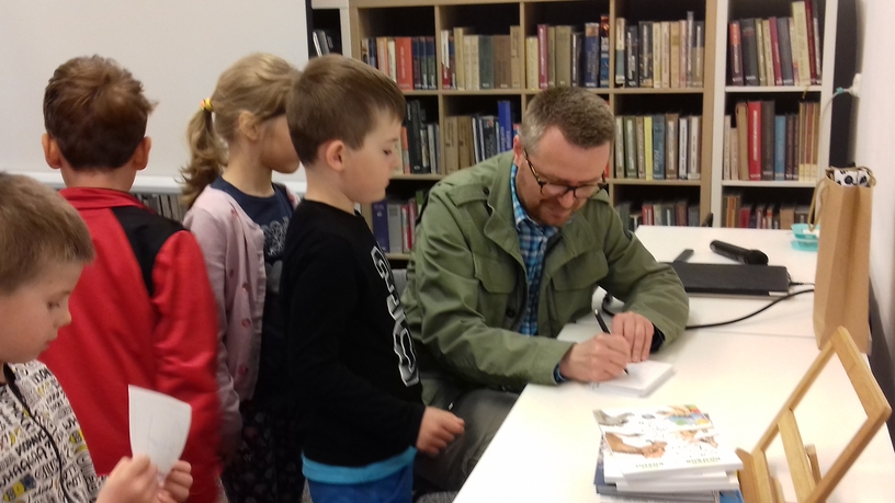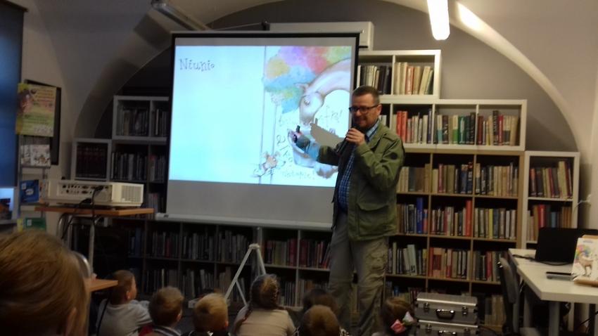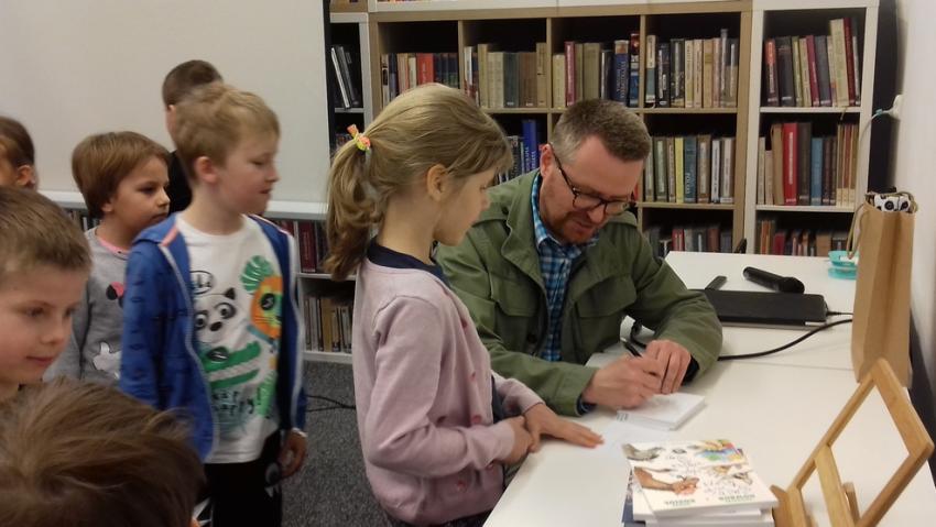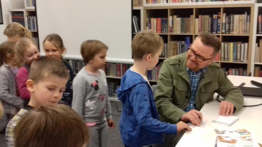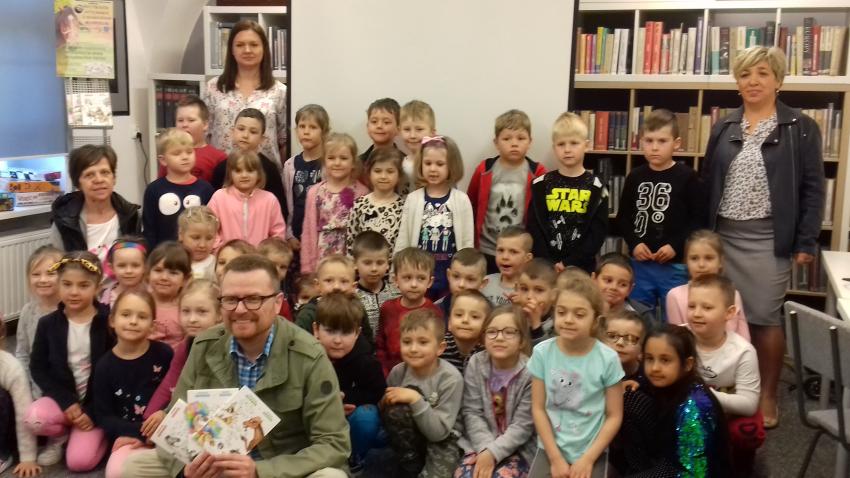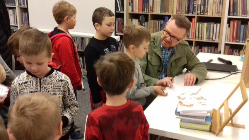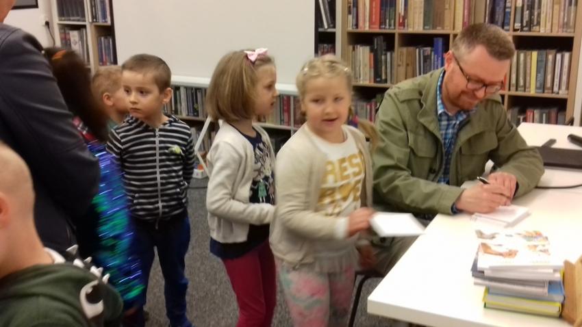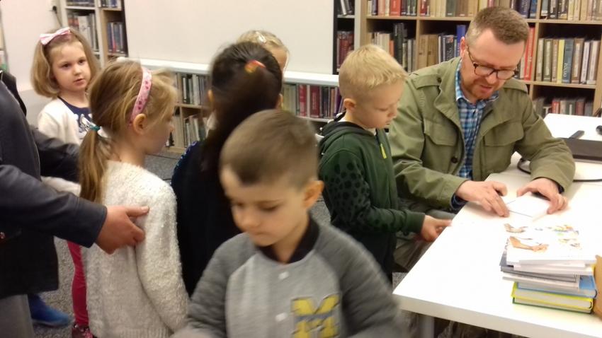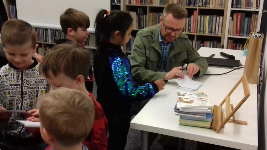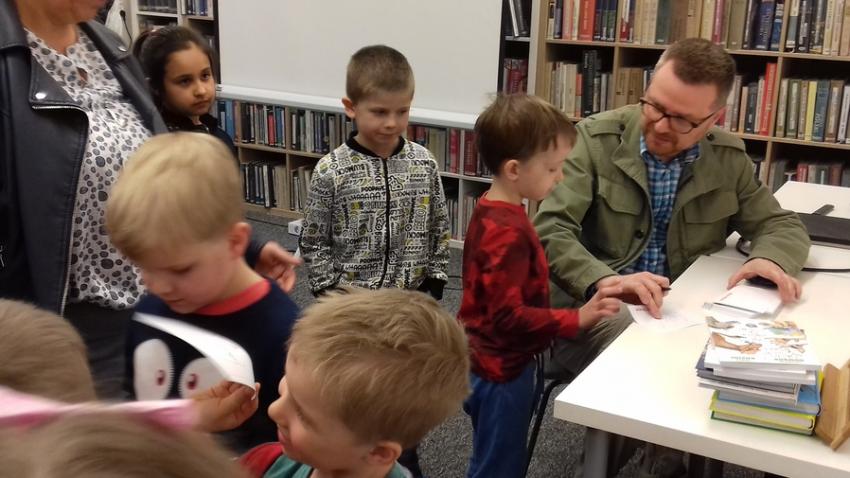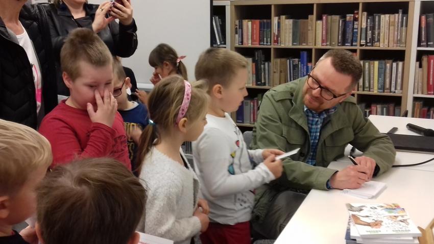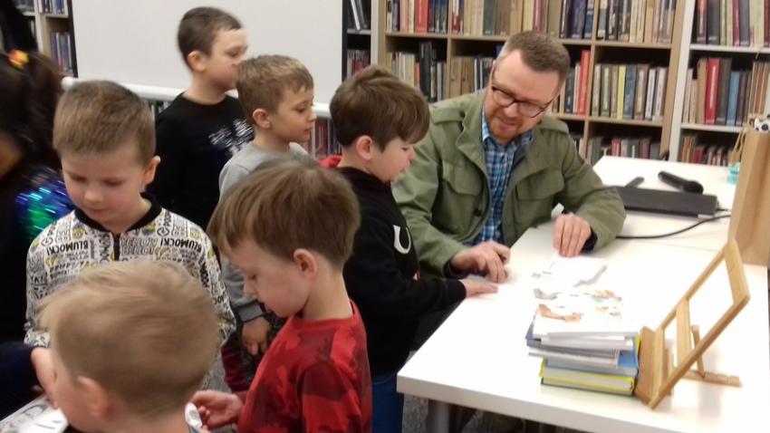 Smerfy i Słoneczka na spotkaniu autorskim z Marcinem Kozidłem w Biblitece